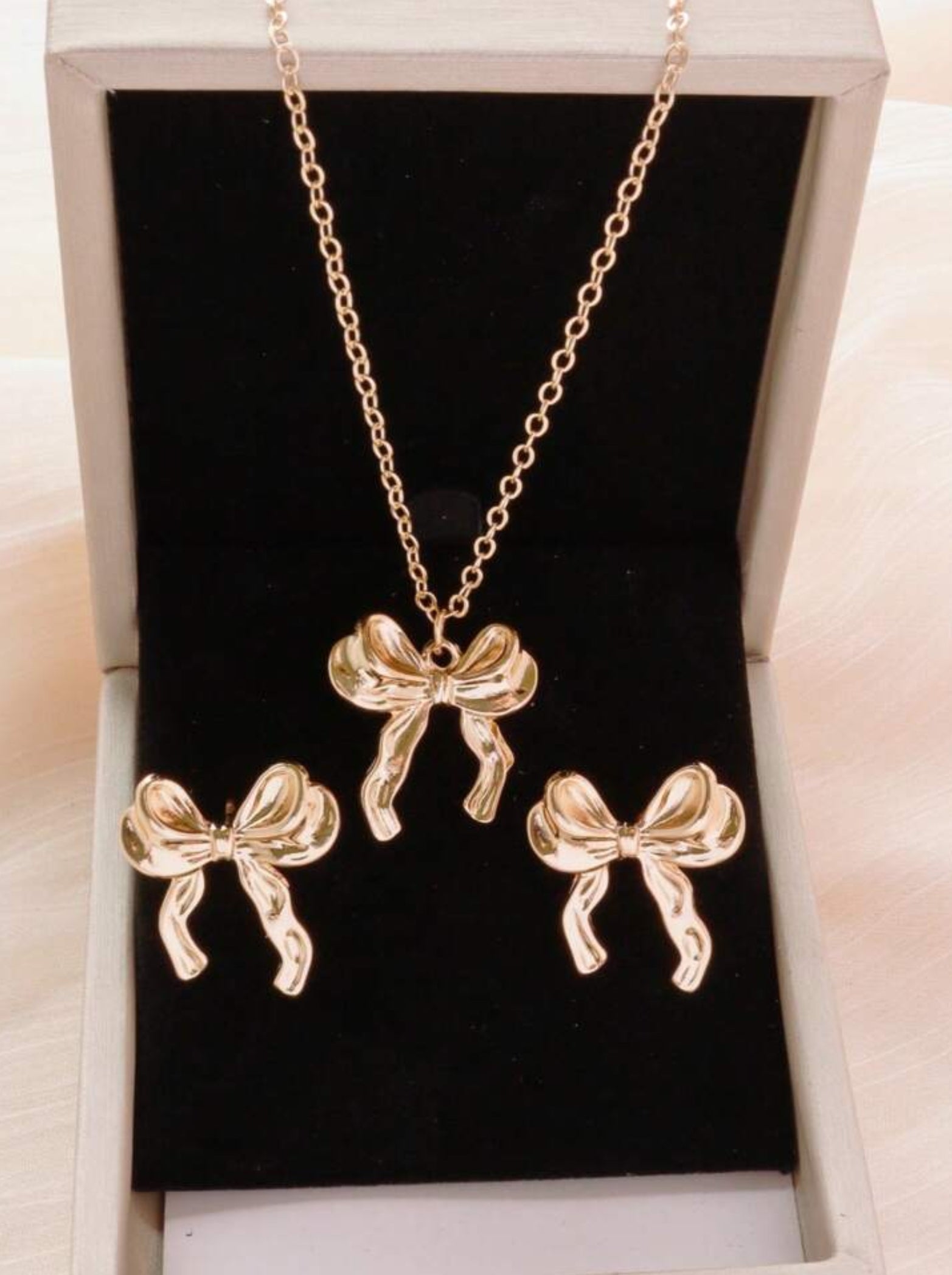 Fashion Ribbon Bow Necklace And 1pair Butterfly Stud Earrings Jewelry Set For Women.