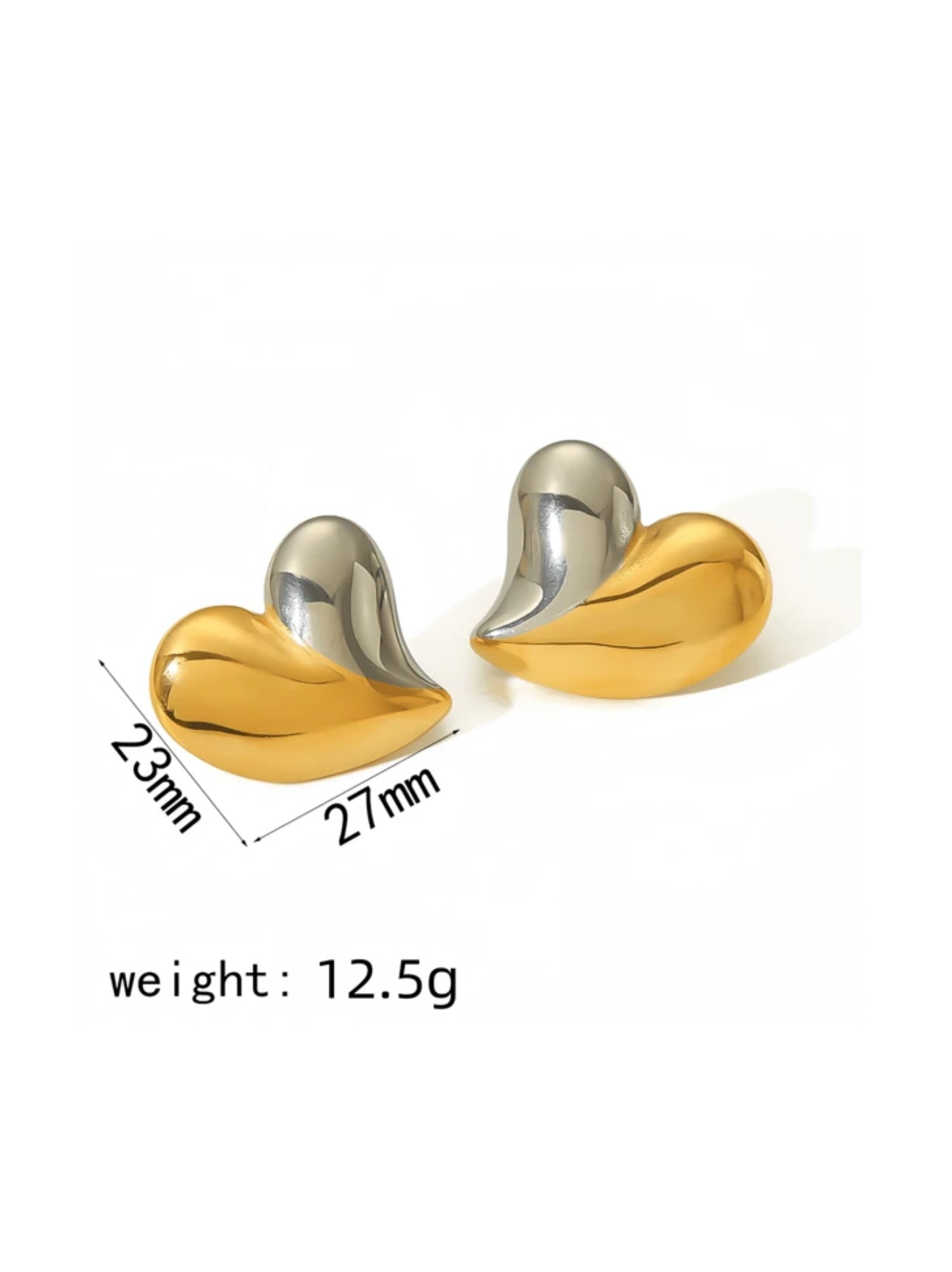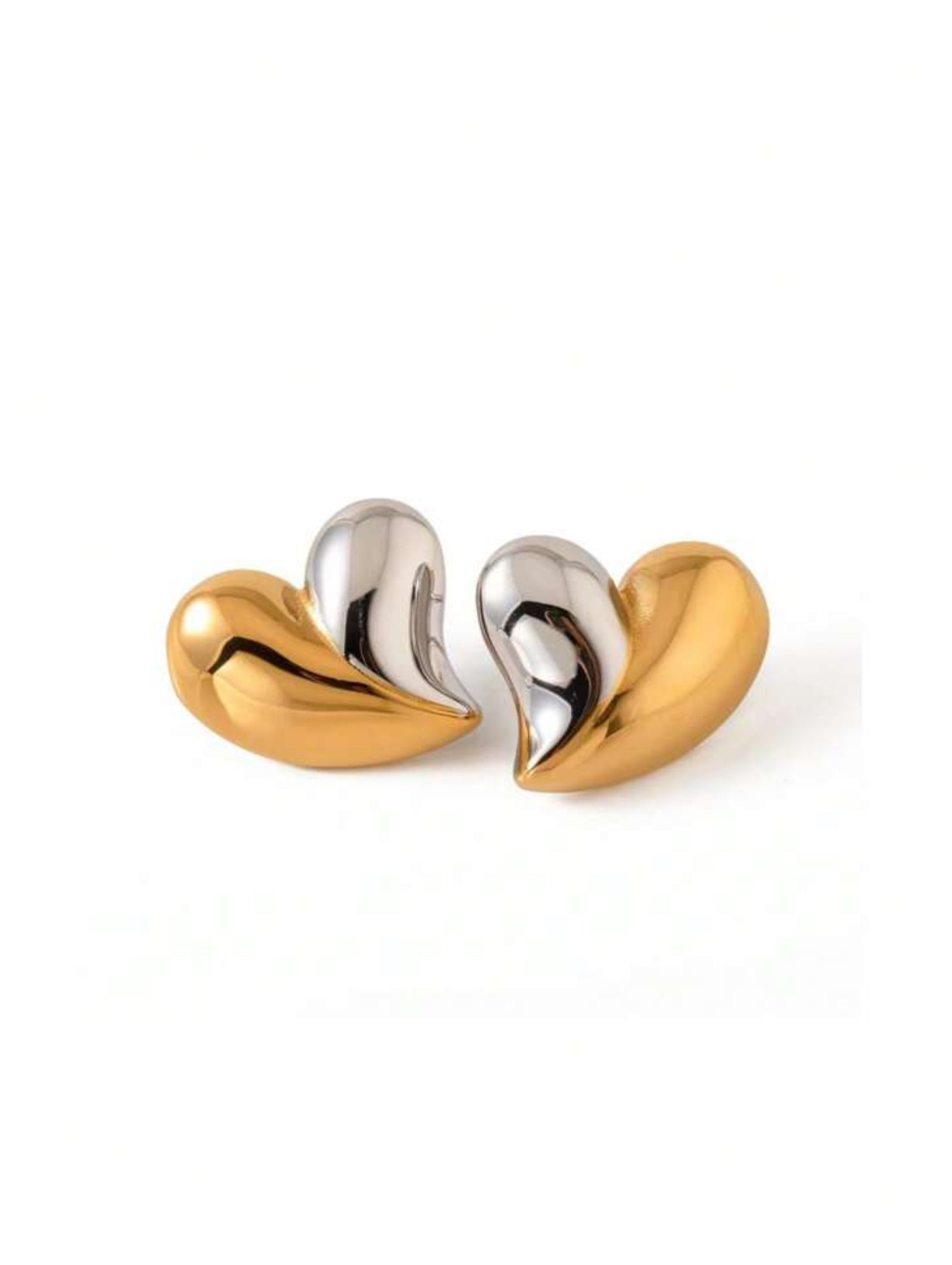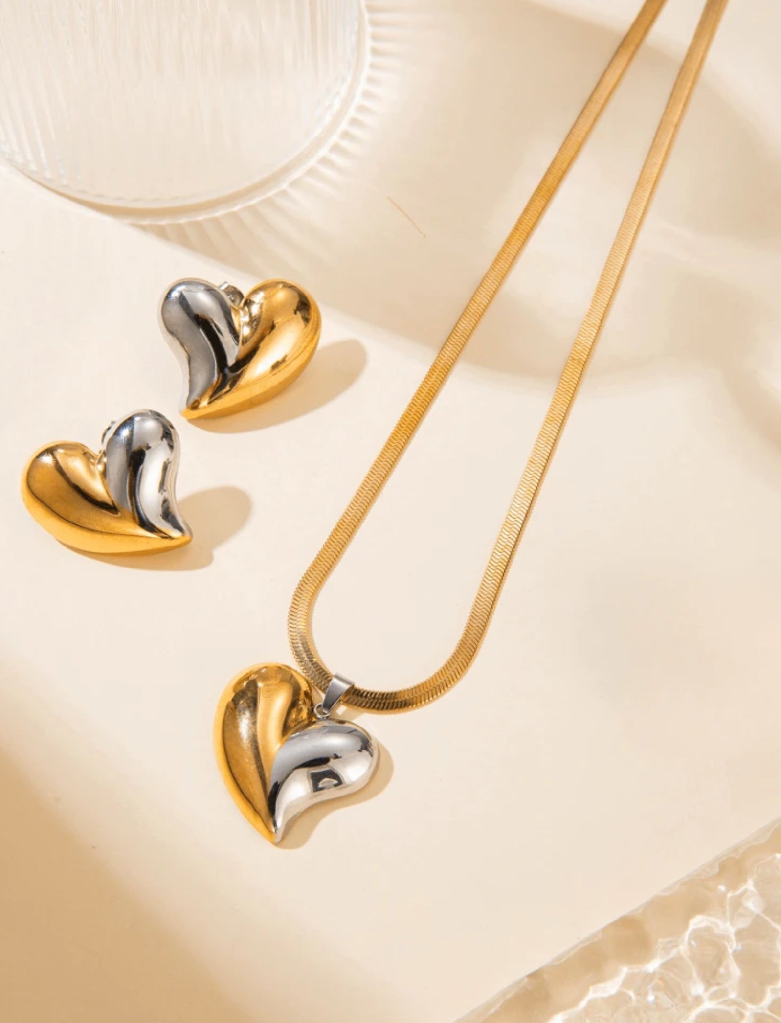 18K Gold Plated Dual Tone Heart Shaped Stainless Steel Stud Earrings and necklace.